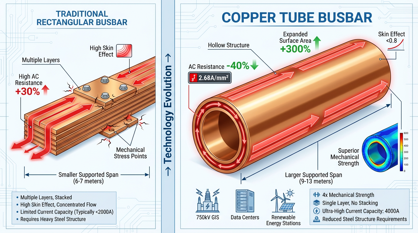 Tabela: Comparação de desempenho de barramentos de tubo de cobre versus barramentos retangulares tradicionais (2025)