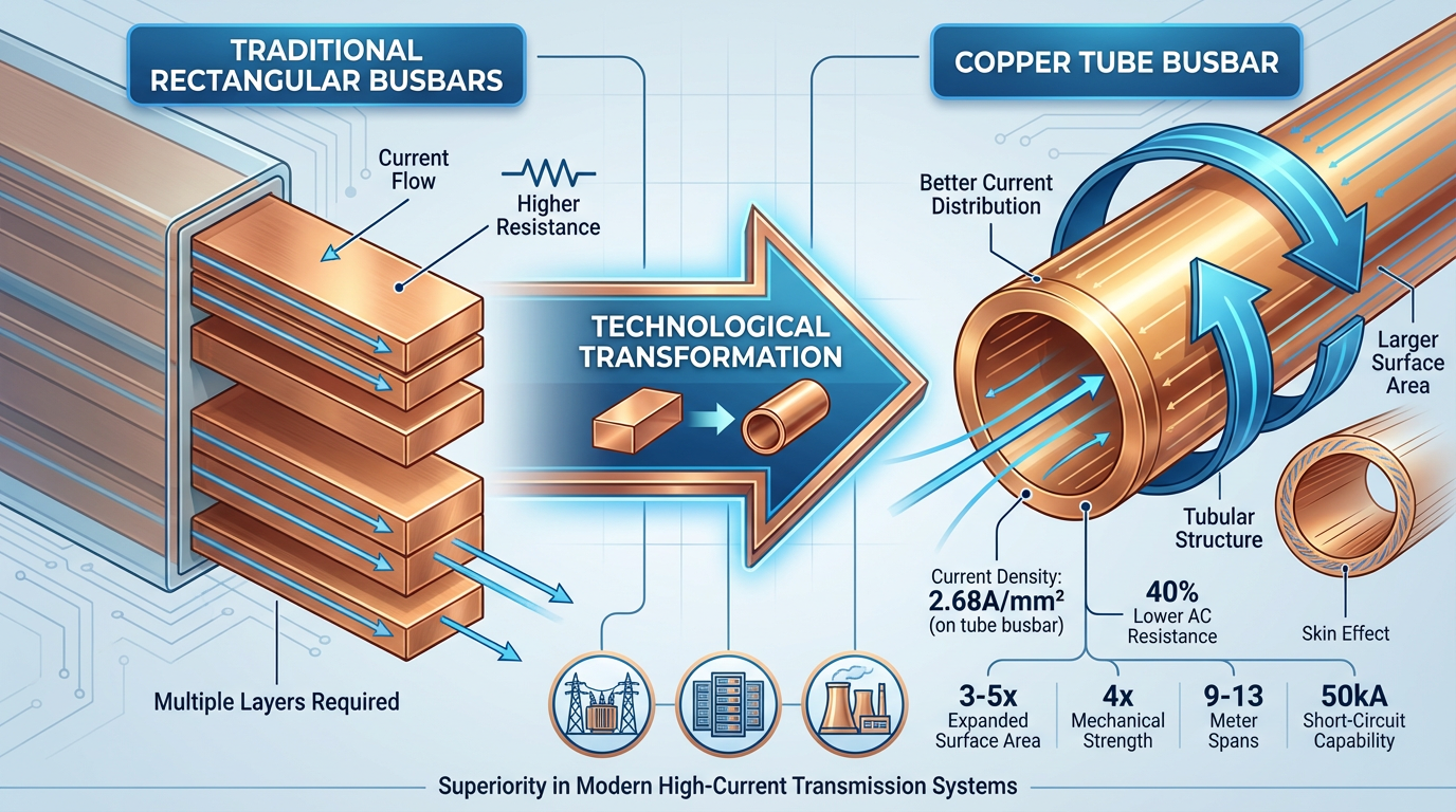 A modernização da infra-estrutura energética global está a impulsionar uma procura sem precedentes por tubo de cobre barramentos. Embora representem apenas 2% a 3% da procura total de tubos de cobre, estes produtos registam taxas de crescimento superiores a 200% anualmente em aplicações como subestações de ultra-alta tensão, centros de dados e novas centrais eléctricas. A principal vantagem reside na sua estrutura tubular oca , que expee a área de superfície do condutor em 3 a 5 vezes, garante distribuição uniforme de corrente ao longo da parede do tubo, reduz o coeficiente de efeito pelicular abaixo de 0,8 e diminui a resistência CA em 40% em comparação com barramentos retangulares de área de seção transversal equivalente.