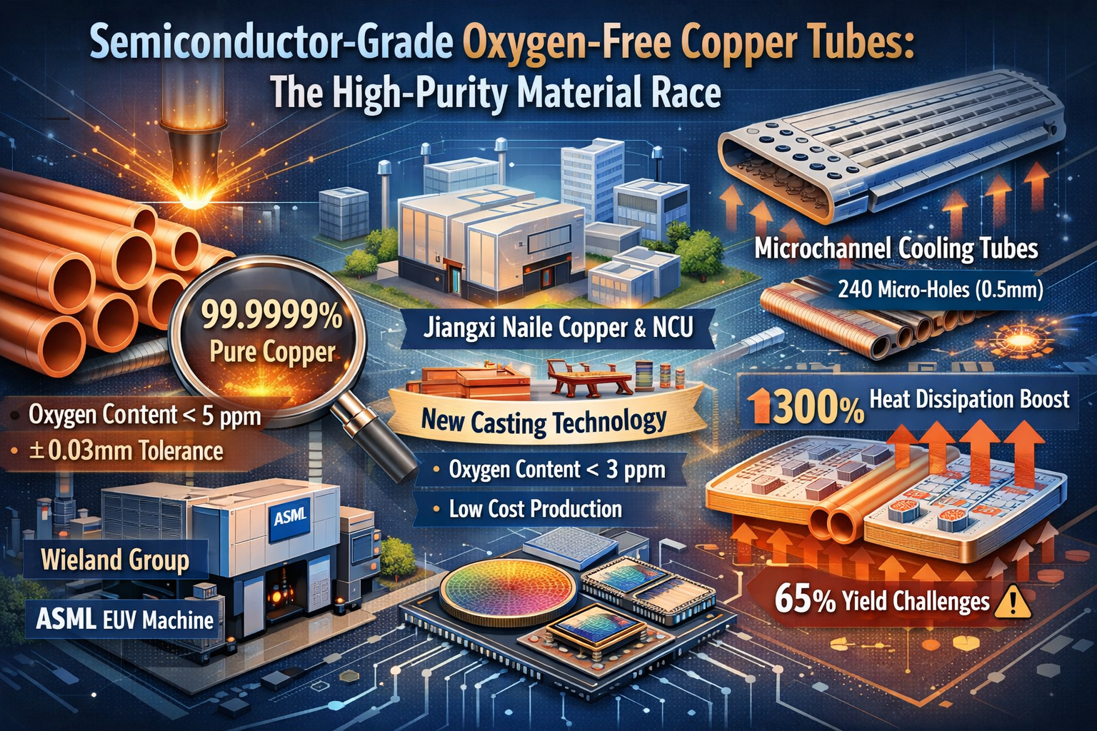 Avanços em econômico alternativas estão surgindo. Jiangxi Naile Copper, em colaboração com a Universidade de Nanchang, desenvolveu um "método de fundição contínua horizontal com divisão de oxigênio ultrabaixo" que controla o conteúdo de oxigênio abaixo de 3 ppm a um oitavo do custo dos métodos de vácuo importados. Esta inovação entrou na cadeia de abastecimento das linhas de produção de 14 nm da SMIC. Aplicações mais avançadas incluem tubos de resfriamento de nível wafer com projetos de microcanais (por exemplo, 240 microfuros de 0,5 mm de diâmetro) para aumentar a eficiência de dissipação de calor em 300%, embora as taxas de rendimento permaneçam um desafio em 65%.