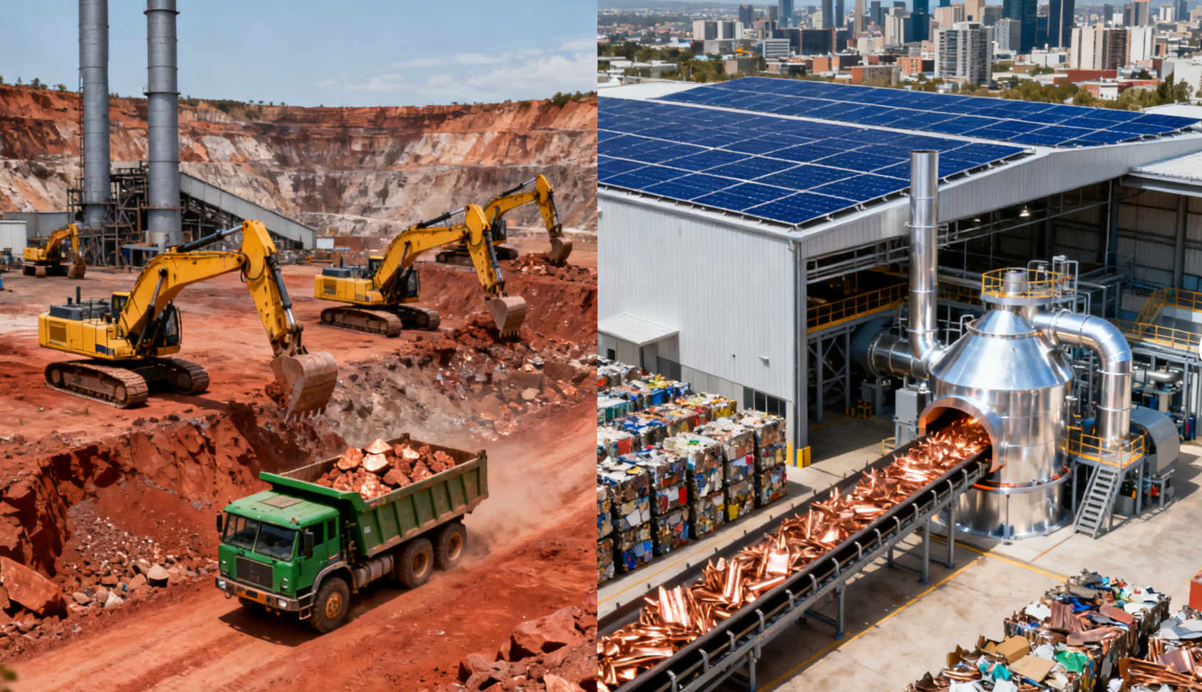 (Legenda: A dicotomia fundamental: Extração de recursos (economia linear) versus regeneração de recursos (economia circular) representam visões opostas para o futuro da produção de tubos de cobre.)