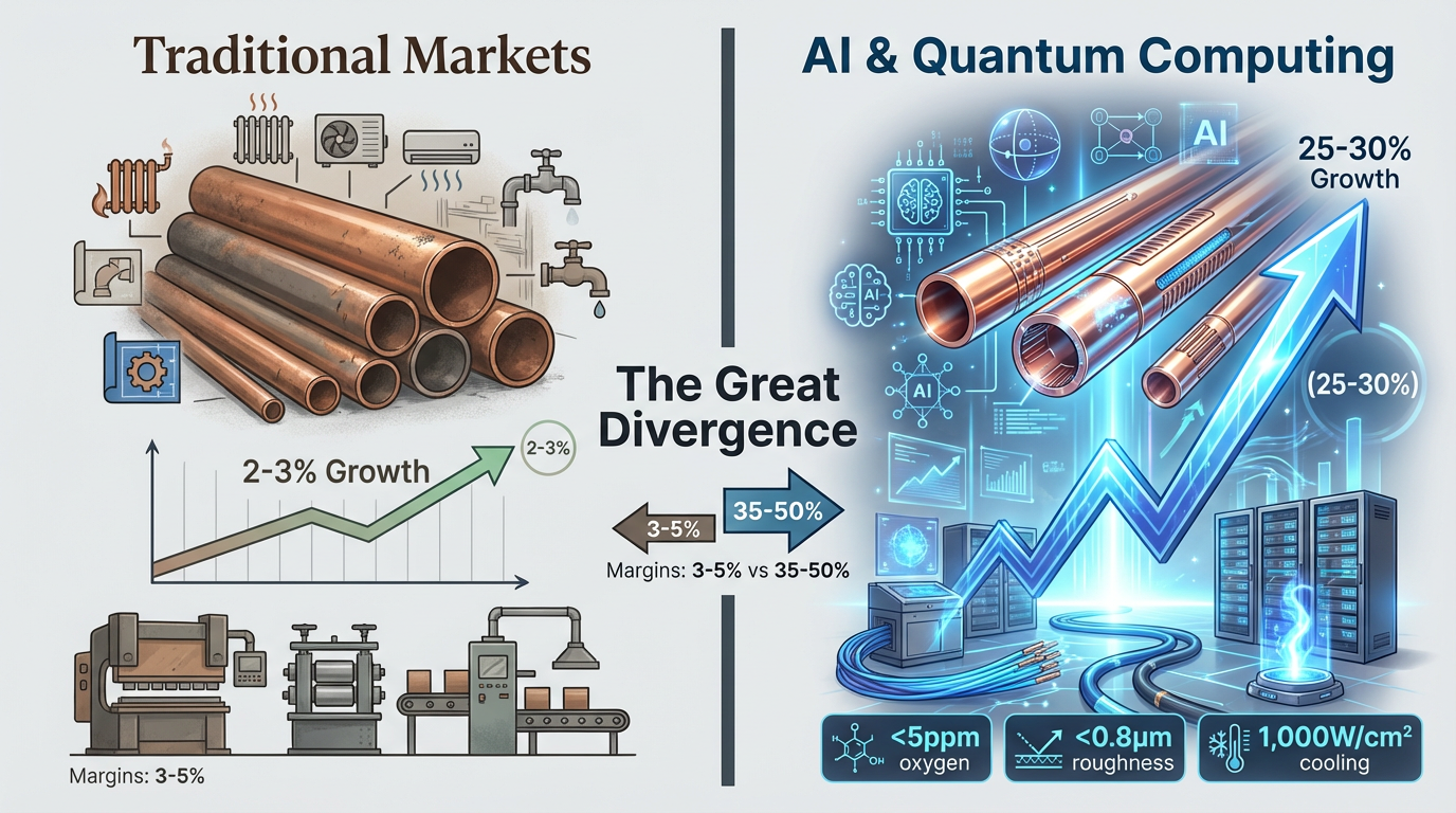 O global tubo de cobre a indústria está passando por uma fragmentação sem precedentes. Enquanto construção tradicional and Aplicações HVAC crescer a modestos 2-3% ao ano, a procura por tubos de precisão na fabricação de semicondutores, na infraestrutura de IA e na computação quântica está aumentando de 25 a 30% ao ano. Esta divergência cria um mercado de dois níveis: os produtores a granel lutam com margens de 3-5%, enquanto os fabricantes especializados obtêm margens brutas de 35-50% para tubos que cumprem especificações extremas.