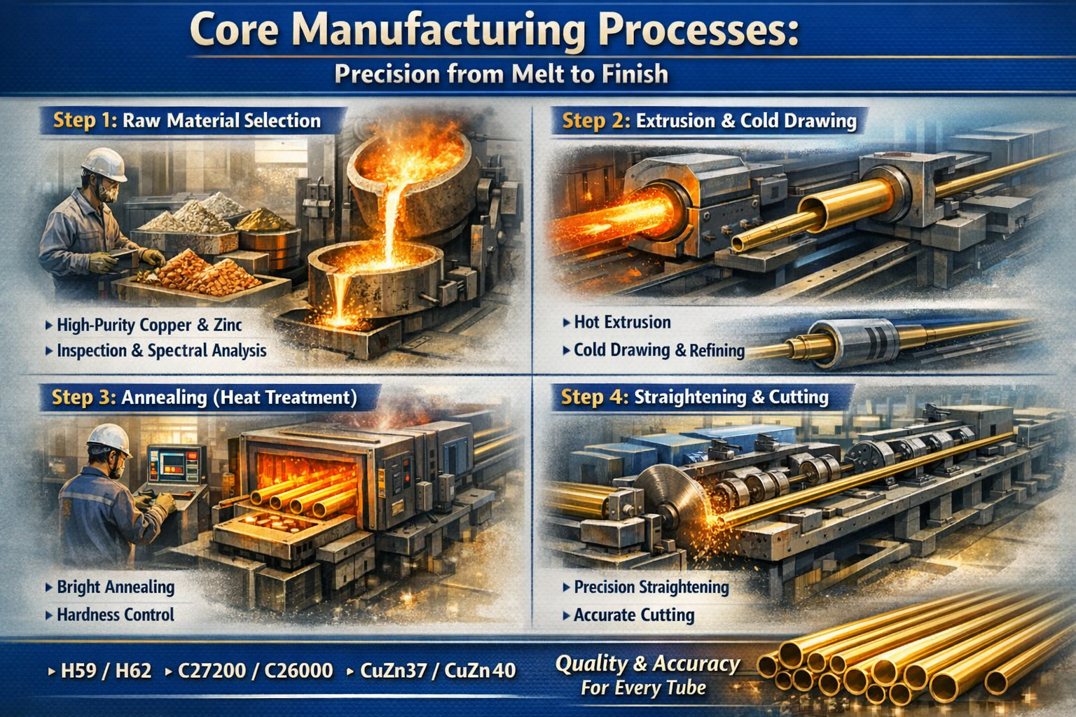 A transparência é a base da confiança nas parcerias B2B. Uma fábrica profissional de tubos de latão não apenas "fabrica" tubos; segue uma sequência rigorosa e cientificamente controlada para garantir que cada milímetro do produto atenda aos padrões internacionais.