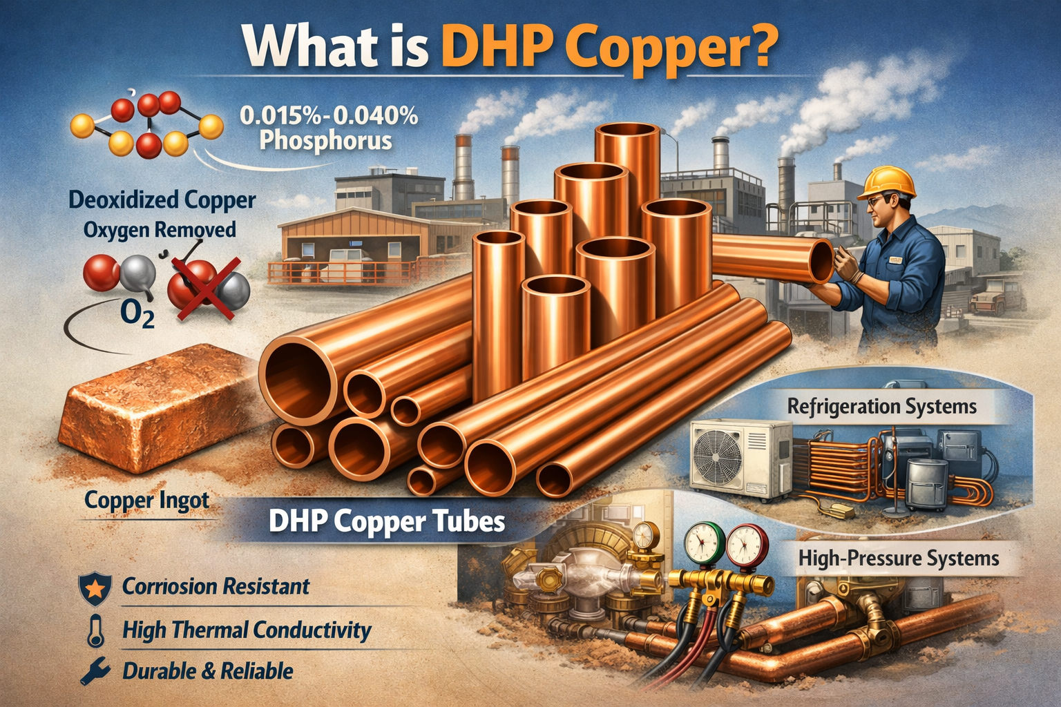 Cobre DHP é de alta qualidade, cobre desoxidado liga que contém uma pequena quantidade de fósforo , normalmente entre 0,015% e 0,040%. A principal característica desse cobre é que ele foi tratado para remover o oxigênio, processo que melhora sua resistência à corrosão e garante melhor desempenho em sistemas de alta pressão. O conteúdo de fósforo melhora ainda mais suas propriedades, torneo-o ideal para uso em aplicações onde durabilidade, condutividade térmica e resistência são críticas.